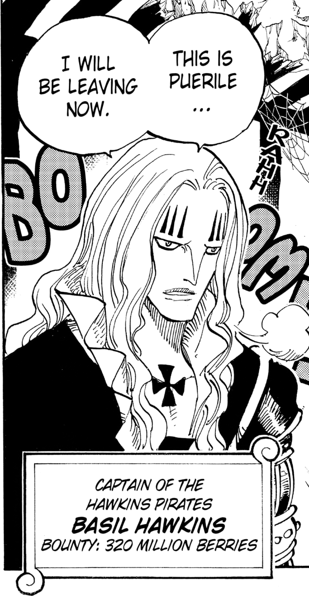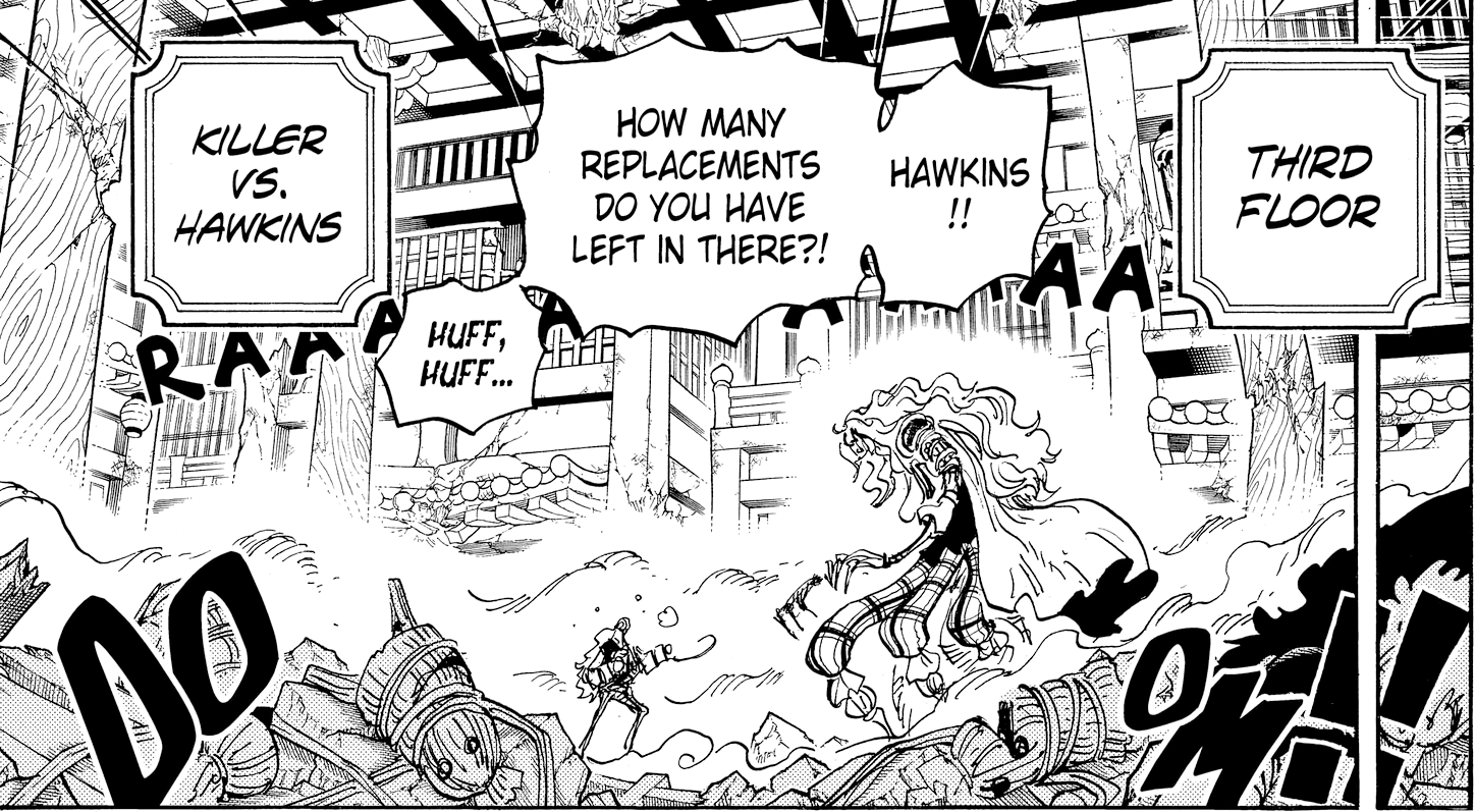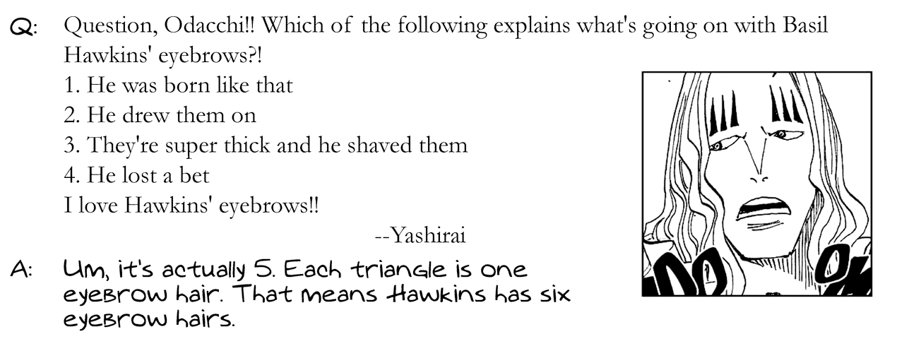 By my counting with csvkit and a spreadsheet I made while cropping the VIZ manga: Hawkins appears in 50 chapters, 26 volumes, and approximately 273 panels as of posting. These numbers are fudged a bit by SBS. You can view my CSV here: hawkins-panels.csv.