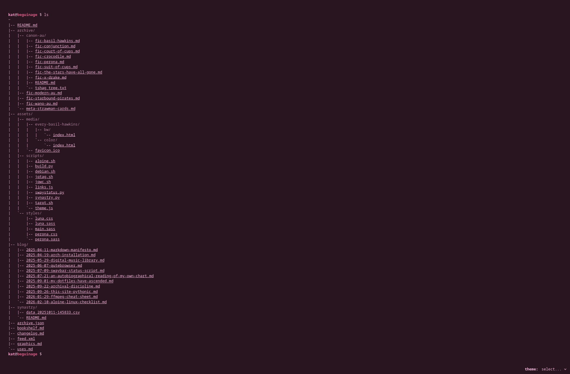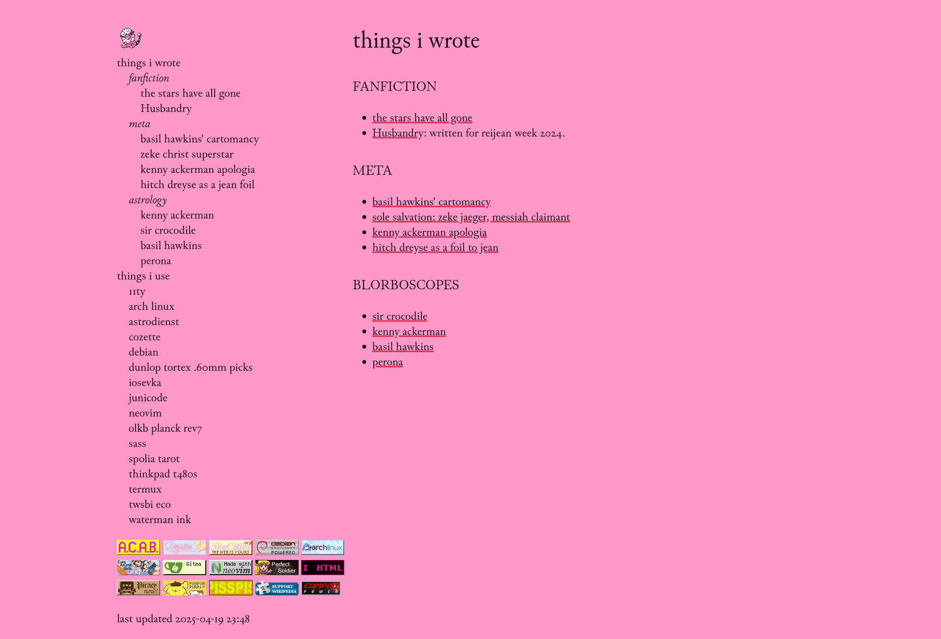 I experienced scope creep with this, I think, when I decided to add Every Basil Hawkins after Tumblr nuked him and Every Perona. But before that, it served me well for as long as I intended to have an aggressively plain text website.