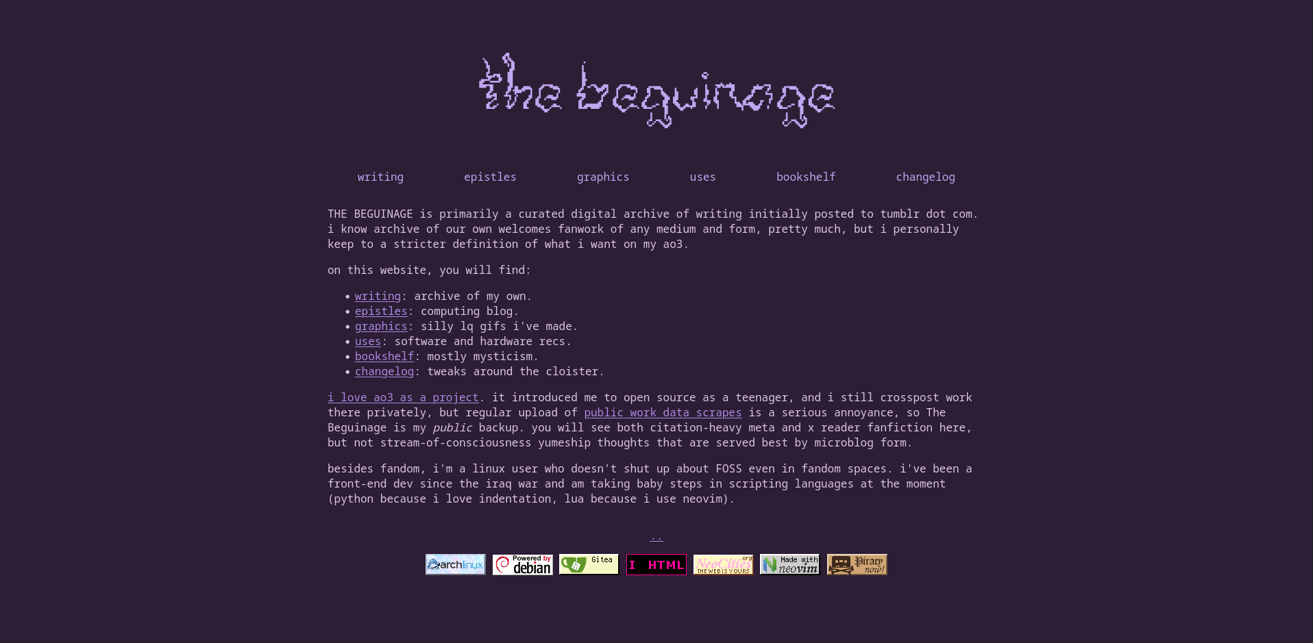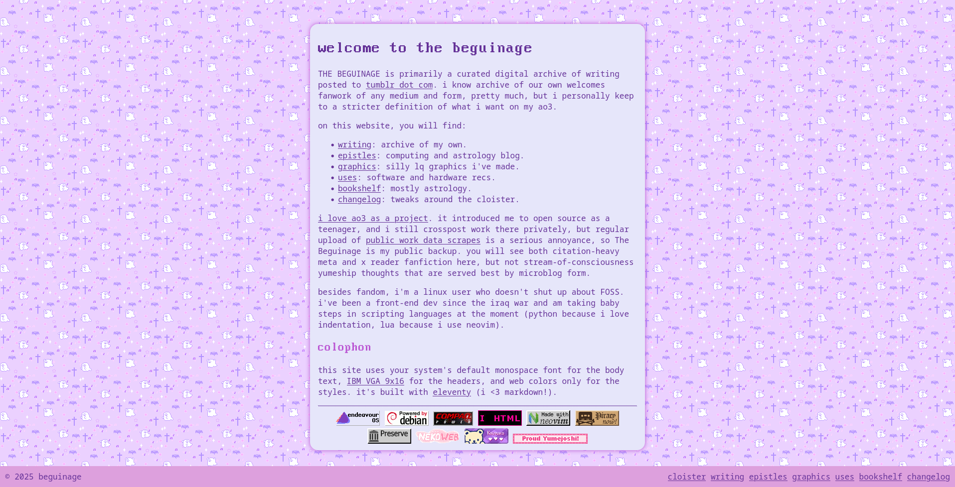I hosted The Beguinage on NeoCities from April to July 2025, then moved to Nekoweb. I've been making static webpages for licherally 20 years, first on Neopets, then putting Tumblr themes on PasteBin, then abusing GitHub Pages for my non-tech portfolio while all my peers used Squarespace. Ultimately: